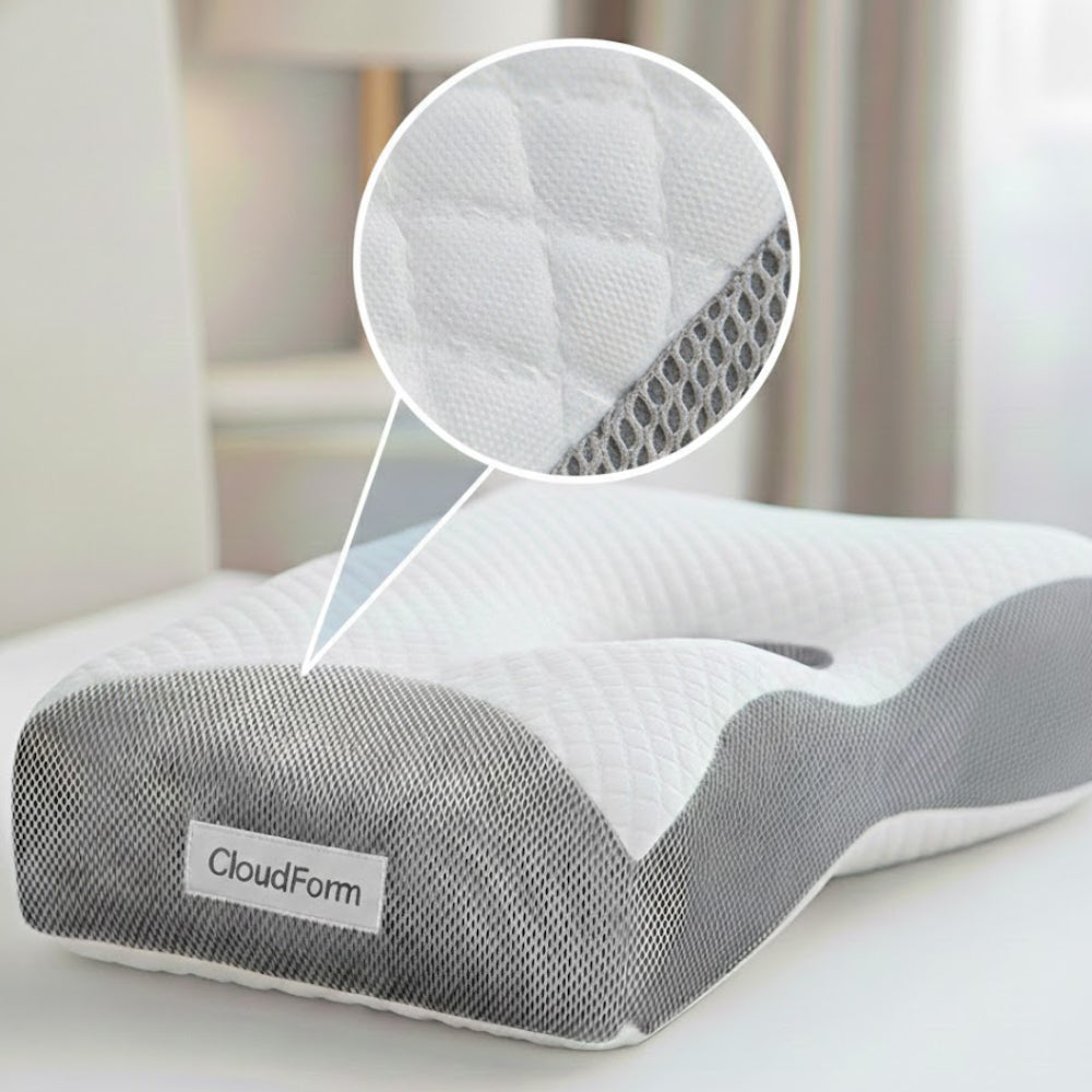 Olvídate de losdolores de cuello y hombros, las noches de insomnio y la fatiga matutina. CloudForm™combinaespuma viscoelástica ergonómicaytecnología transpirablepara adaptarse perfectamente a tu cabeza y cuello, aliviando la presión y manteniendo la columna alineada.